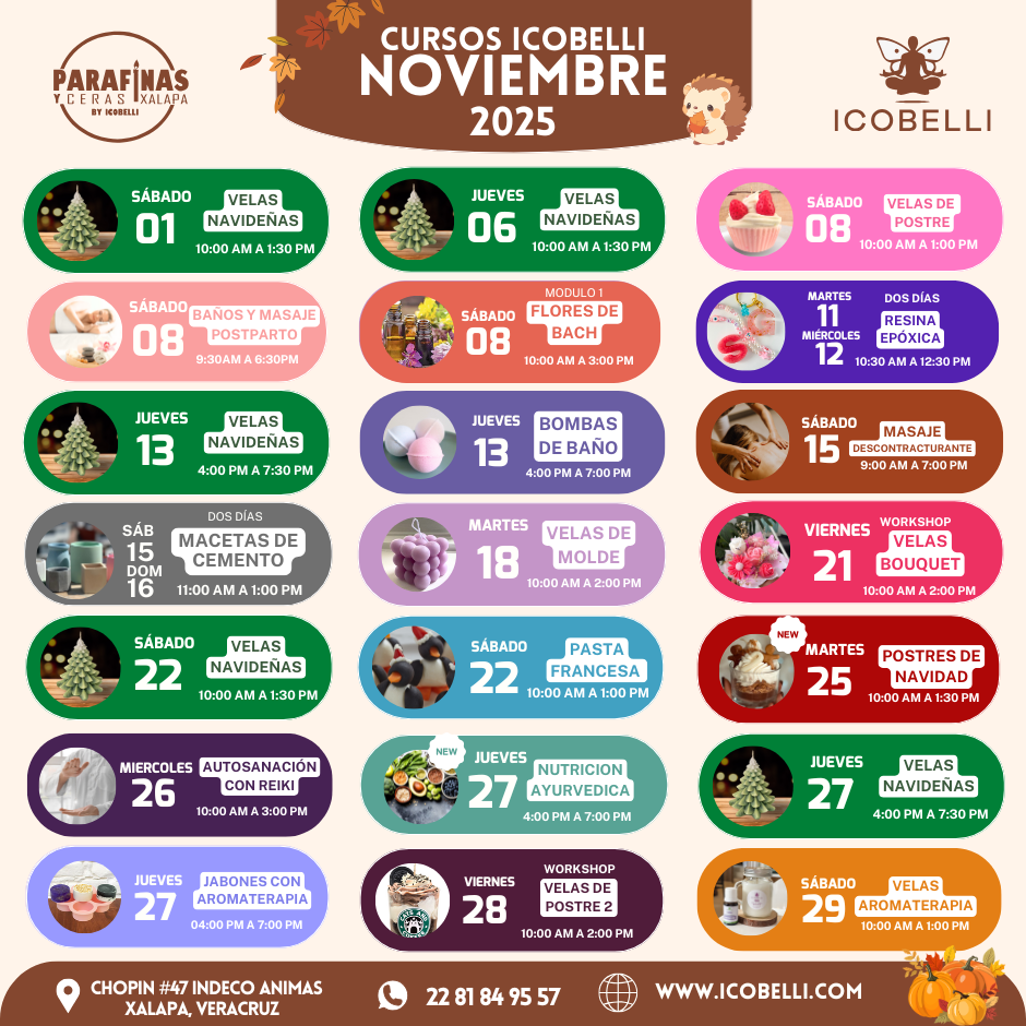 Este taller consta de una parte teórica y una parte práctica, aprenderás los tipos de ceras y parafinas, sus diferencias y sus usos. Conocerás los aditamentos para realizar velas tipo postre (fragancias, colorantes, aditivos, etc), los tiempos y temperaturas necesarios.